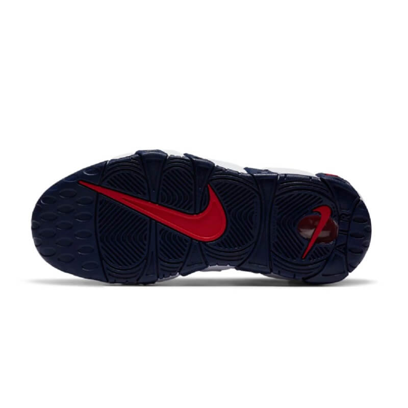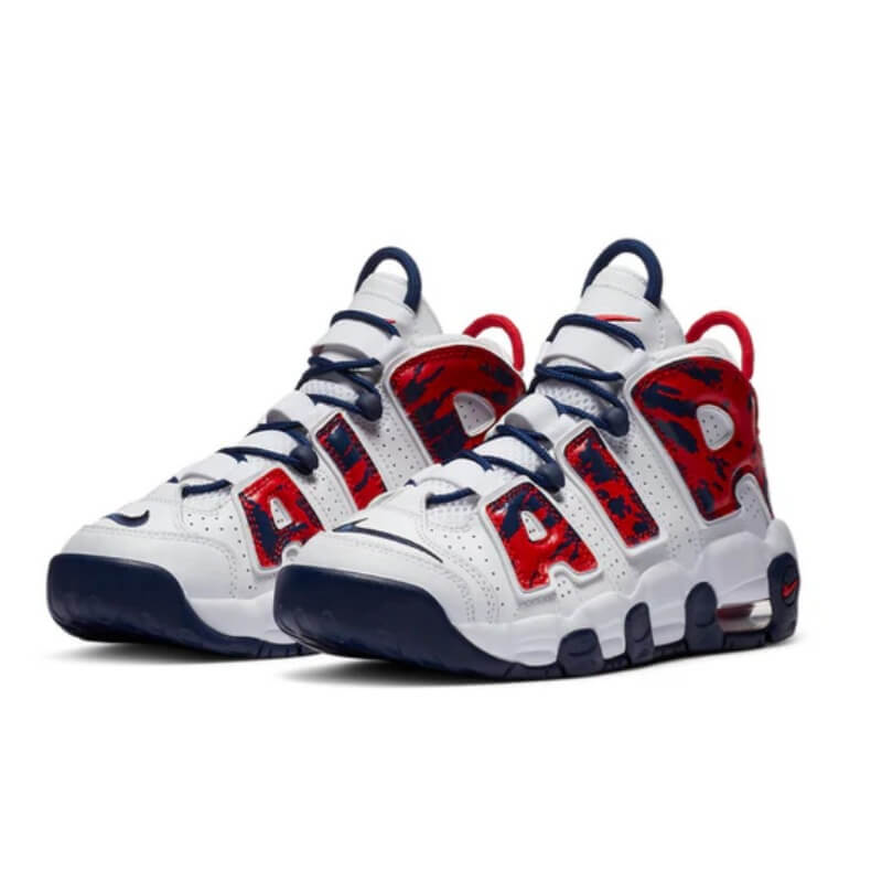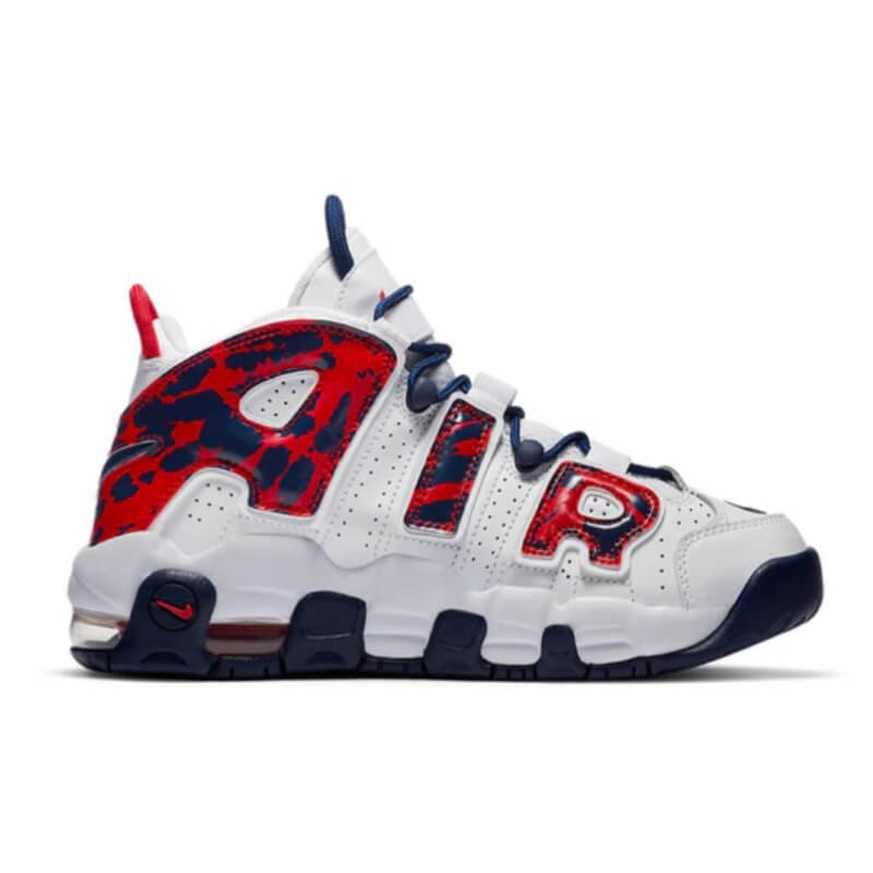 Make a bold statement with the Nike Air More Uptempo “Red Navy Camo” made in Vietnam. This sneaker combines a striking red and navy camouflage pattern on the classic oversized “AIR” lettering with a sturdy leather upper and full-length visible Air cushioning. Designed for style, comfort, and long-lasting performance.